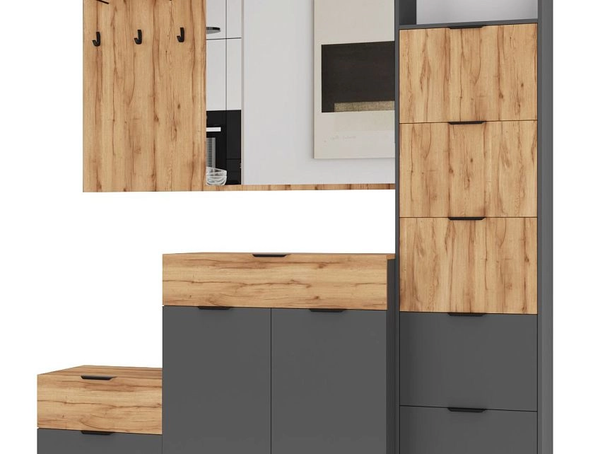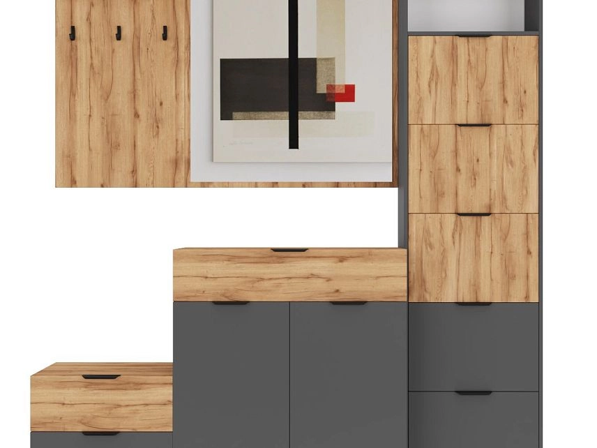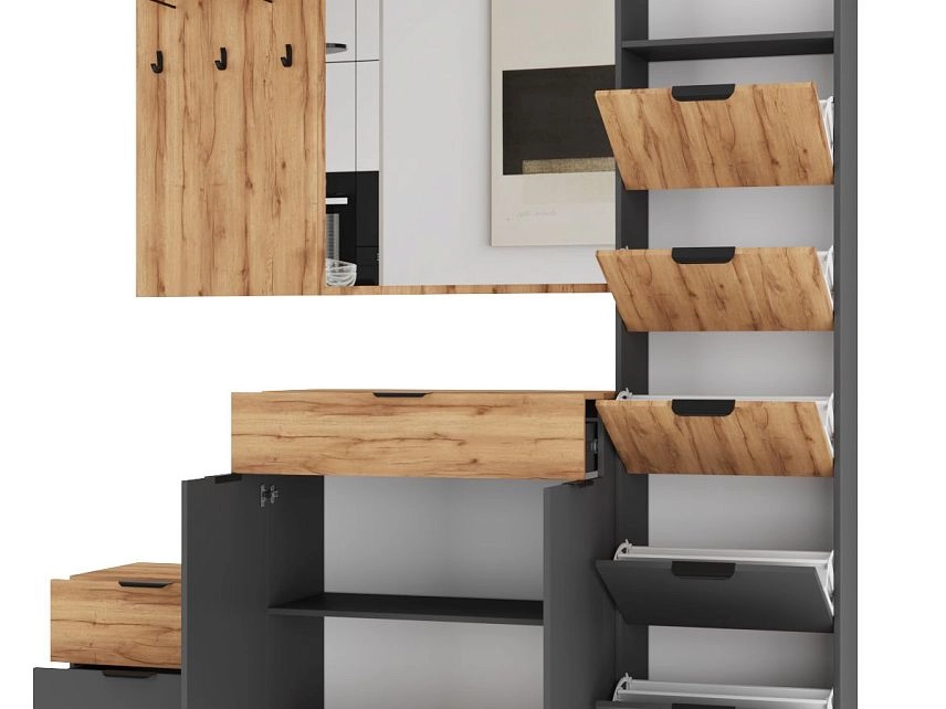Комплектация: ручка мебельная торцевая 128 мм, черный RT110BL.1/128/150 BOYARD, арт.719962-2; крючок мебельный однорожковый ВМ-2 металлический черный АЛДИ, арт.07219; опора мебельная регулируемая прямоугольная №6 54*54*20 мм металлик АЛИДИ, арт.10196; шариковые направляющие, вешалка-кронштейн 192*75ММ черная АЛДИ, арт.07192